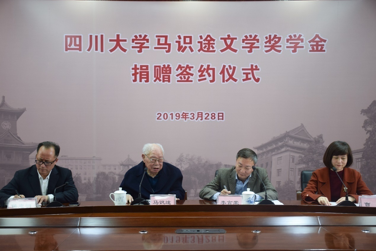 教育基金会秘书长荣建国签署捐赠协议,并向李言荣校长递交捐赠支票牌。李言荣校长向马识途先生颁发捐赠证书并赠送了纪念品。