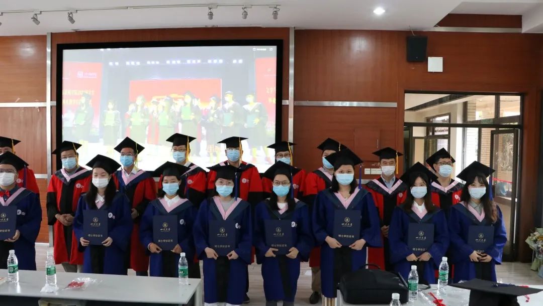 在为2020届校友联络人颁发聘书后,学位授予仪式正式开始。主会场学位分委员会主任曹顺庆教授、李怡院长以及分会场古立峰书记、周维东副院长、操慧副院长分别为色情短视频