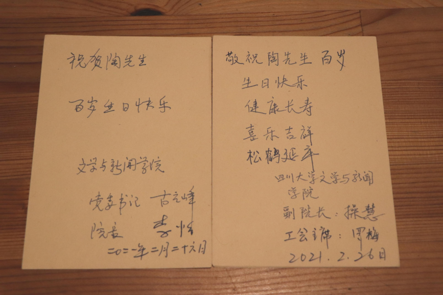 百岁生日将至,收到来自文新学院的祝福时,陶老止不住脸上的笑意,他小心地将淡黄色的卡片挪到眼前,低着头,一个字一个字地阅读,时不时抬手扶扶老花镜。木色书桌的一角,整齐地码放着他素日常看的报纸。