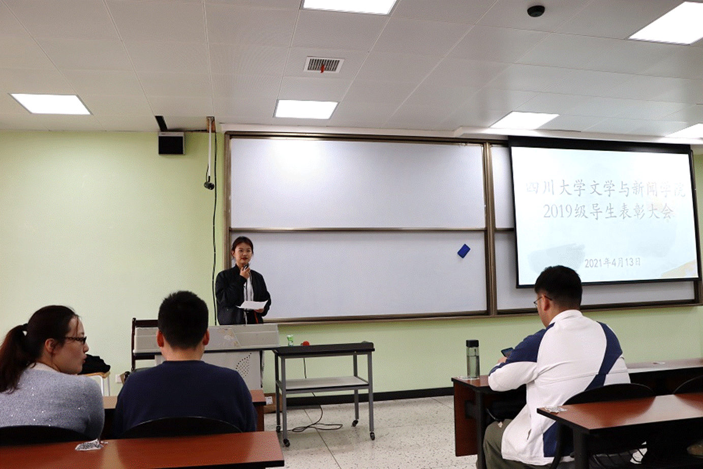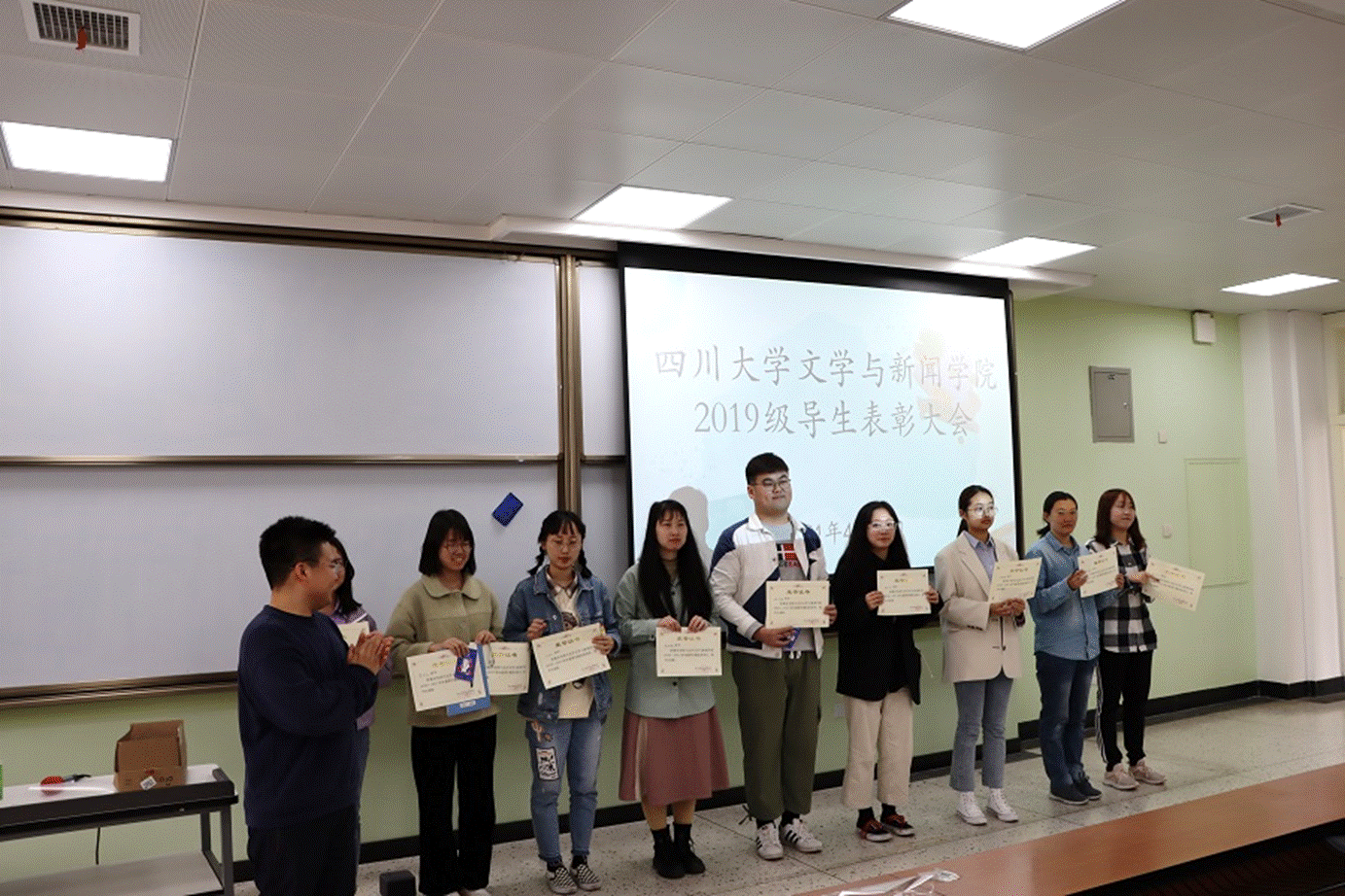 2019级导生表彰大会在江安校区第一教学楼B座301举行。2020级本科生辅导员胡余龙老师、兼职辅导员王一冰老师等嘉宾出席大会,2019级全体导生参加本次大会。