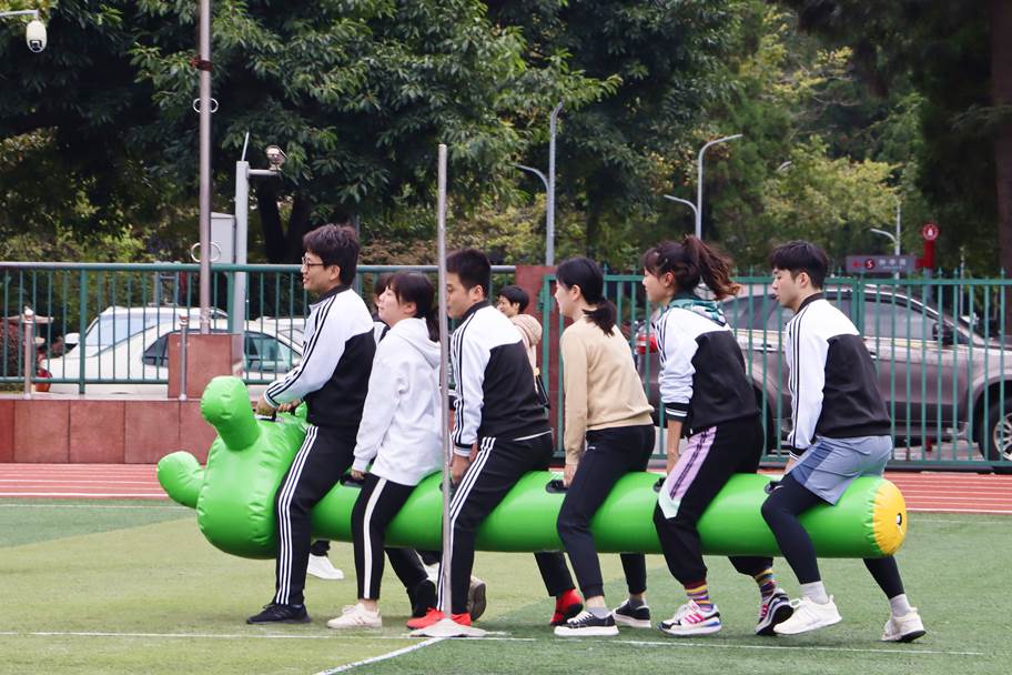 运动会项目兼具竞技性与趣味性,除跑步、跳远、跳绳、实心球等常规比赛项目之外,还有毛毛虫竞速——这项运动需要六名参赛选手共同“驾驭”一个4米长的充气毛毛虫前进,这种运动形式也被称为“旱地龙舟”,考验团队成员之间的协作水平和默契程度。