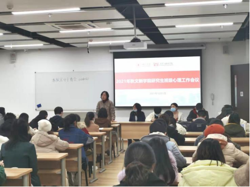 党委副书记张莹老师、文新嘤鸣坊负责人段化鞠老师、博士生辅导员吴光芬老师、2021级硕士辅导员王志华老师、2020级硕士辅导员雷子慧老师、2019级硕士辅导员陈羲老师以及研究生各班级心理工作负责人等80多人参加了会议。