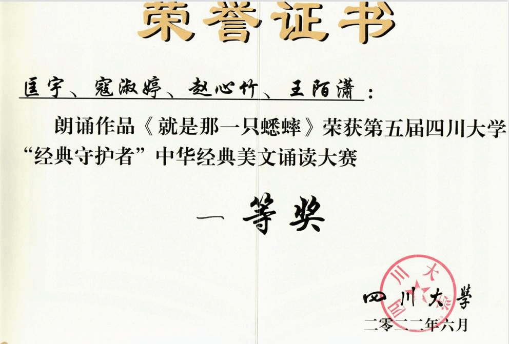 匡宇副教授、寇淑婷副教授、赵心竹老师和王陌潇老师共同朗诵的参赛作品《就是那一只蟋蟀》荣获一等奖。