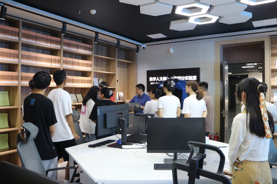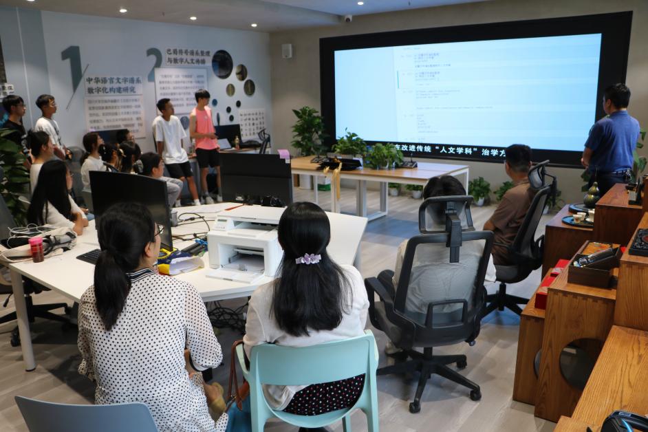实验室主任邱树雄老师的介绍下,两院师生一起参观了学院中华文化传承与全球传播数字融合实验室,现场了解了数字人文典籍大数据分实验室、数字文学场景沉浸分实验室与数字多模态符号认知分实验室的功能定位与运用情况。