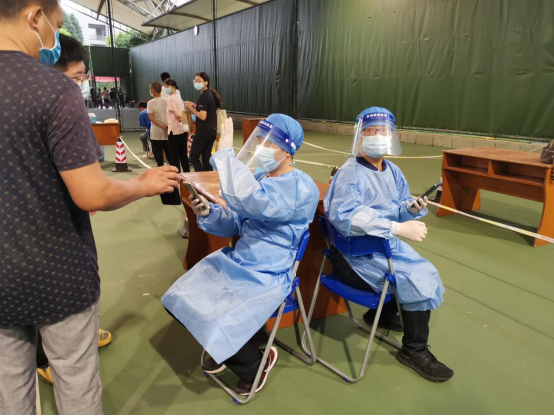 教师党员在江安校区网球场核酸检测点工作现场
