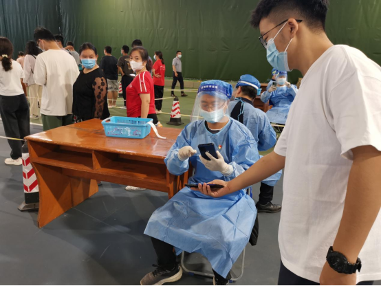 党员志愿者们早上8点就来到江安校区网球场校内核酸检测点,在校医院医务人员的指导下换好防护服,做好防护措施,认真学习如何手机录入测试师生的健康码信息、录入核酸检测试剂信息等,做好了人员分工,在现场秩序维护、信息录入等岗位上积极开展工作。老师们忘我工作到中午12点,换班吃过午饭后,又继续工作到2点过,协助医务人员顺利完成了核酸采样工作。