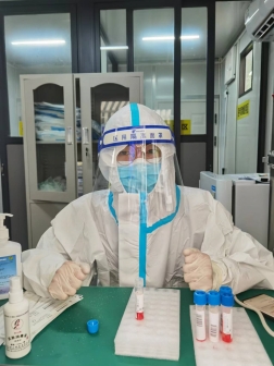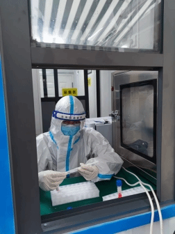 张祖扬同学在核酸采样亭内工作