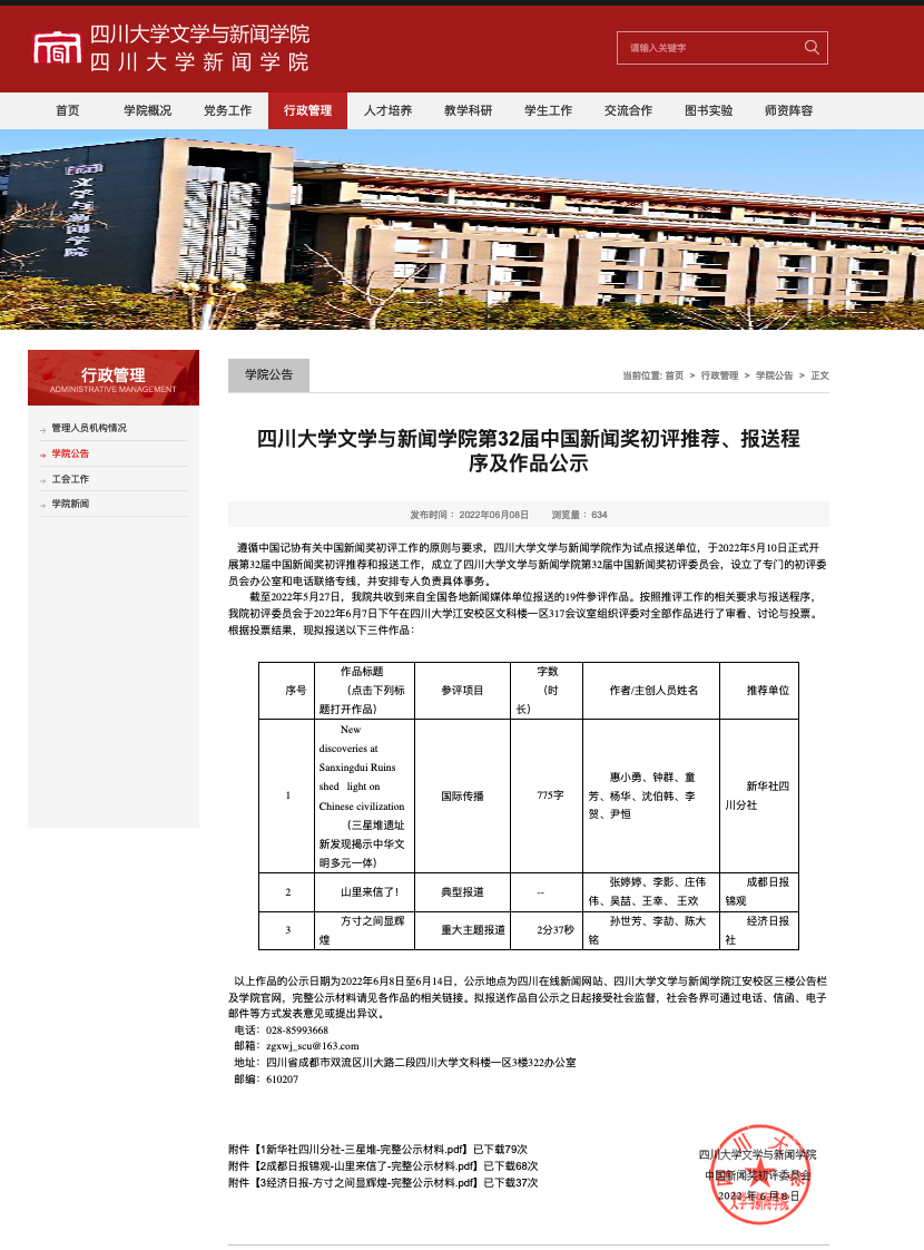 2022年11月8日,中华全国新闻工作者协会主办的第32届中国新闻奖评选结果揭晓。四川大学文学与新闻学院报送的新华社作品《New discoveries at Sanxingdui Ruins shed light on Chinese civilization(三星堆遗址新发现揭示中华文明多元一体)》和成都日报作品《山里来信了!》分别荣获国际传播类和典型报道类三等奖。这是自2016年起担任试点报送单位以来,色情短视频