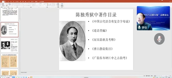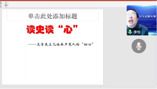 在强调思政课重要性的基础上,李怡院长将“思政”与“专业”相结合,从中国现代文学的角度,选取了以陈独秀为代表的共产党人,通过对他们革命信念、责任担当、专业著作的细致讲解,向同学们讲述了中国文学史上几位共产党人的“初心”。李院长总结道:“他们怀揣着热烈的理想,以纯粹之心推动着革命的发生与中国的发展。”