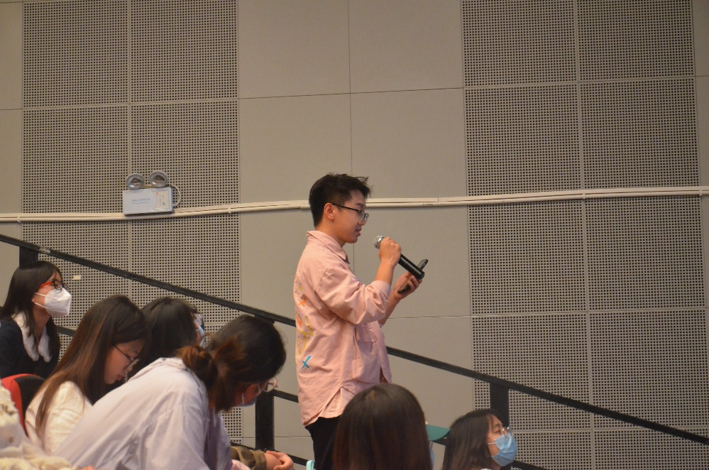 在剧目尾声,演员们以“漫步、日出、咖啡、灯影、糖”五个词为引,邀请全场观众共同作诗,共赴这场春天诗会。现场观众积极分享了自己的作品,同时也讲述了创作的心路历程。一位同学即兴写下“萃一杯咖啡,或是加奶,或是加糖。香,我也尝;苦,我也尝”;辅导员郑格老师结合自己对生活的感想,分享了她在2019年写在备忘录里的诗,“幻想,是裹着糖衣的暗淡。你尝了它的甜,也化掉了它的伪装”。