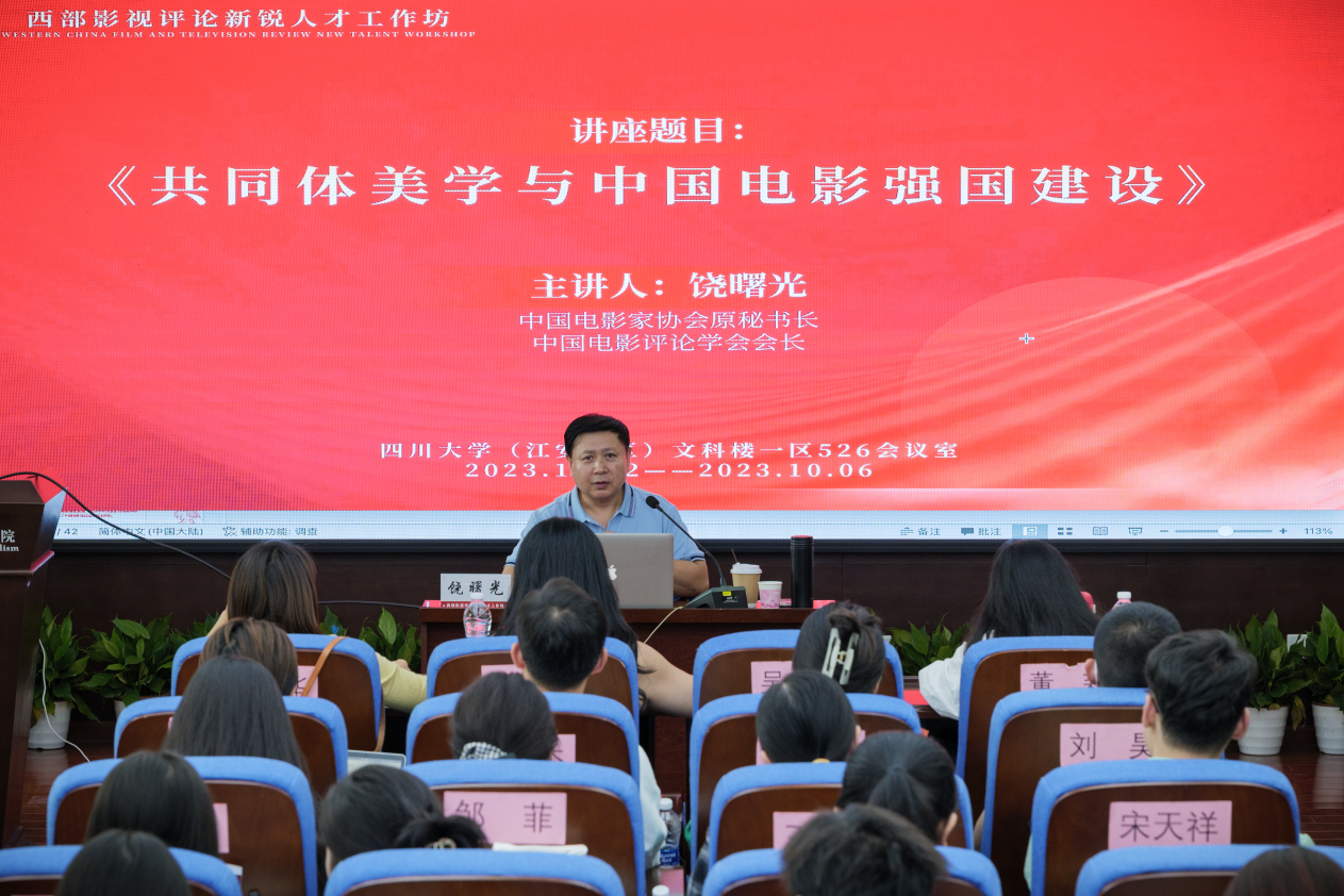 10月3日下午,中国电影家协会原秘书长,中国电影评论学会会长饶曙光先生作题为《共同体美学与中国电影强国建设》的讲座,就共同体美学的学术理念、研究方法与远景建设进行了全面阐述。