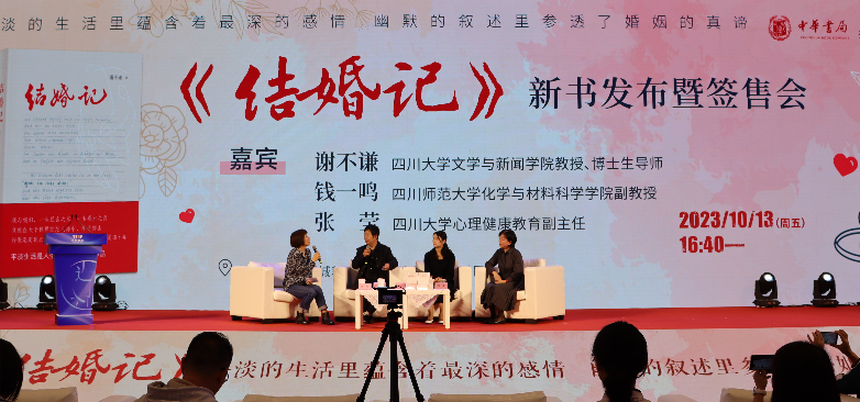 在两场新书发布会上,谢谦教授和大家分享了《结婚记》这本书中所凝练的自己对于婚姻生活的思索和体悟。对于当下“婚姻只有短暂保鲜期”的说法,谢老师言道,婚姻是一个互相理解、包容的过程,不但要包容一个人的优点,也要包容一个人的缺点。“这个世界上本就不存在十全十美的人。”接着,谢老师以书中一篇文章《绝食记》举例:“当我和爱人吵架后,刚开始是我绝食不吃饭,然后她(钱老师)又开始绝食,但是我们并没有化解这个矛盾。最后还是得靠我们相互理解、相互包容。”