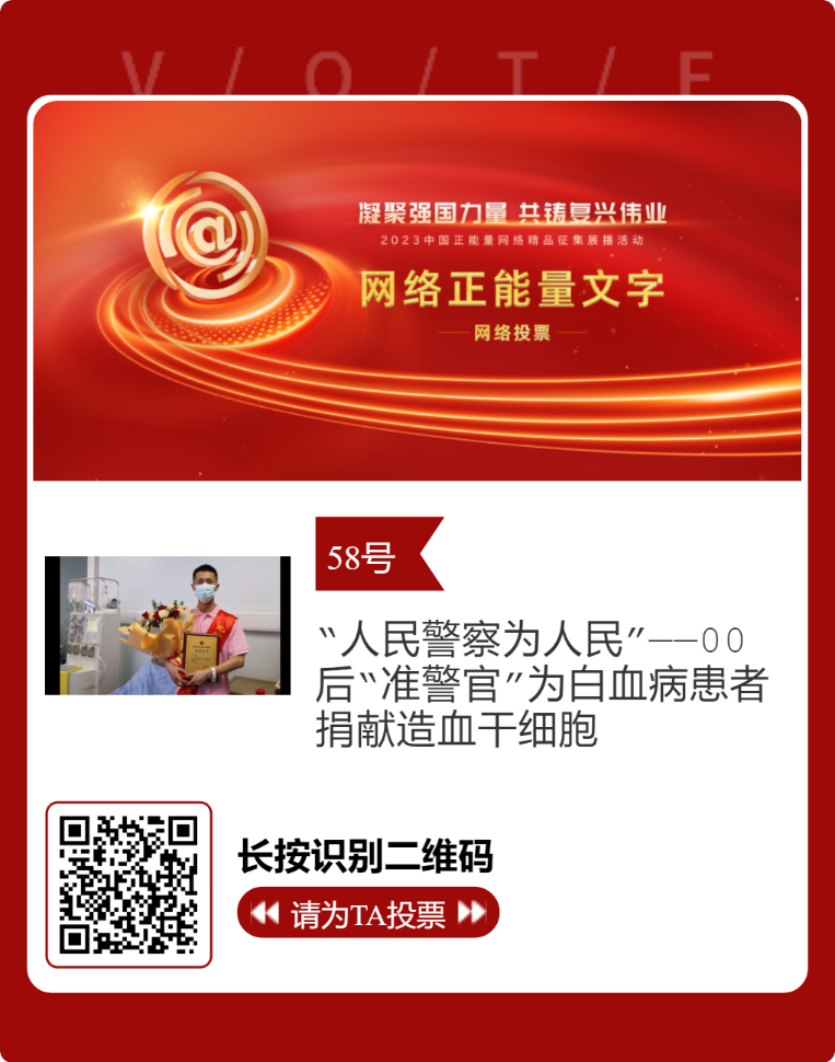 报送的四川省红十字会作品《“人民警察为人民”——00后“准警官”为白血病患者捐献造血干细胞》成功入围终选,进入网络展播投票阶段,时间为2月27日至3月4日,投票结果将作为中国正能量网络精品终选的重要参考。