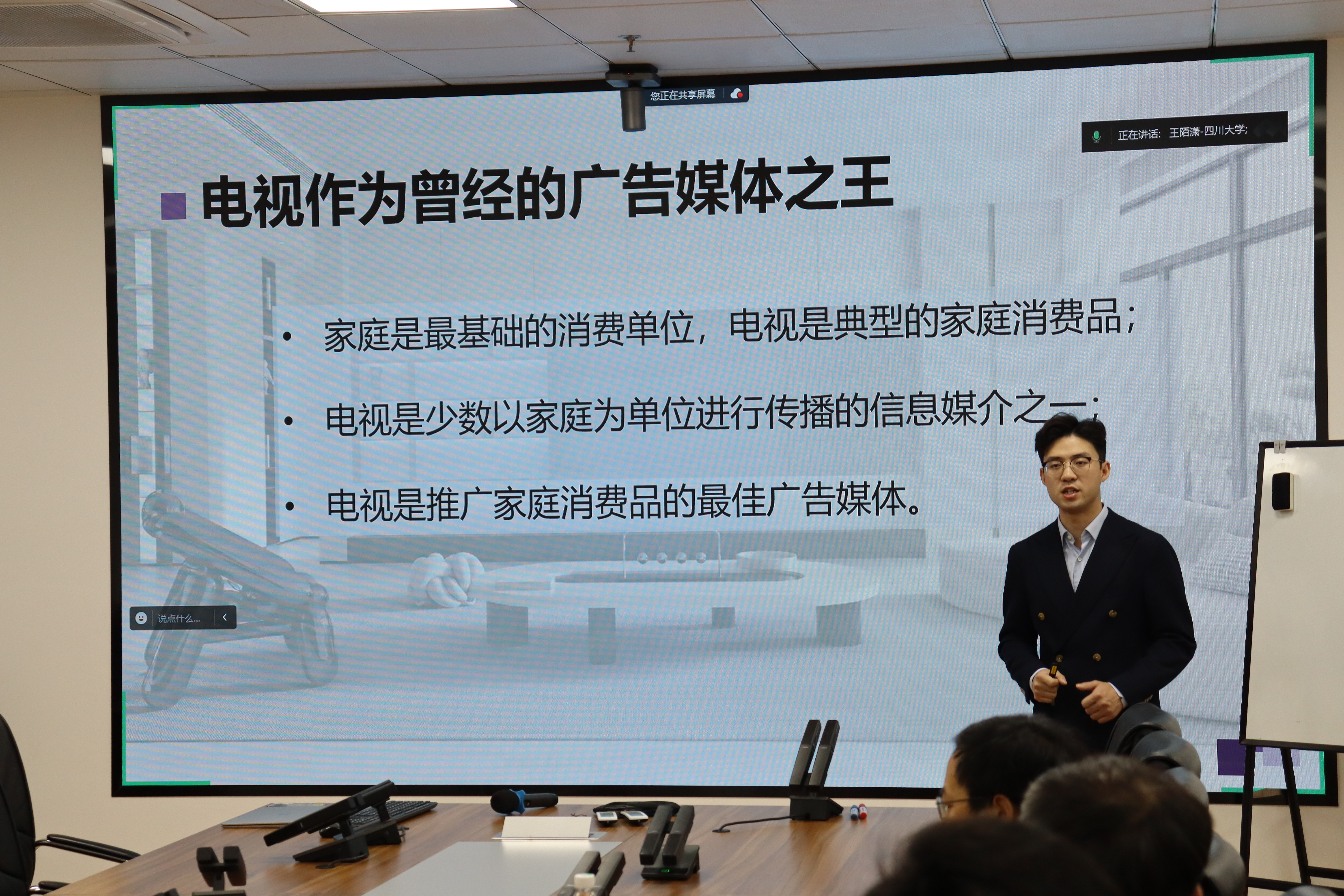 院长李怡教授、教学副院长罗鹭教授、广告学教研室主任饶广祥教授、彭虹副教授以及四川省高校青年教师教学竞赛一等奖获得者妥佳宁教授和李果副教授。会议旨在促进教学技能的交流与提升,共同探讨优化课程设计和教学方法的有效途径。