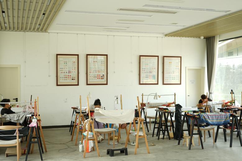 “我们从大运会筹备开始就一直在绣制相关产品,准备了好多年。”王章芳老师指着展厅中央陈列的第31届世界大学生运动会相关产品娓娓道来。在成都大运会开幕式入场环节,运动健儿们阔步走在“锦绣之路”上,各代表团入场引导牌纹样也由蜀绣在蜀锦上一针一线绣制而成。她说,成都大运会是青春的盛会,更是世界的盛会。选用蜀绣作为主视觉形象元素,是希望借此向全世界推广蜀绣这项传统非遗工艺,让更多青年人关注和保护非遗文化,推动蜀绣迈向国际化、年轻化,增强中华文明传播力、影响力。团队成员还注意到蜀绣创意中心里也陈列着多元化的新式蜀绣产品:精致可爱的蜀绣文创产品、电竞比赛冠军定制的蜀绣冠军服、新中式婚礼旗袍及配饰……它们与唐昌布鞋等非遗产品联合创制,不断增强乡村创造力、文化感染力与消费吸引力,越来越受到青年消费者的喜爱与追捧。