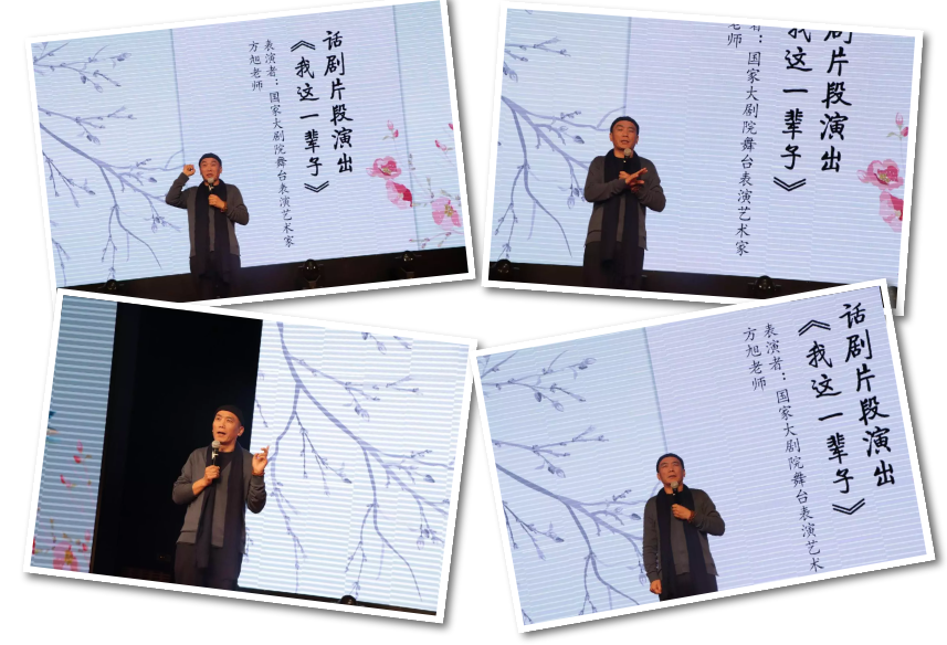 春天诗会暨首届金沙诗歌颁奖典礼上,方旭老师身着便服表演了话剧片段《我这一辈子》。即便无布景无道具,他也凭借一只话筒、简单的肢体语言和深厚的台词功底,将该片段中的巡警形象展现得淋漓尽致。