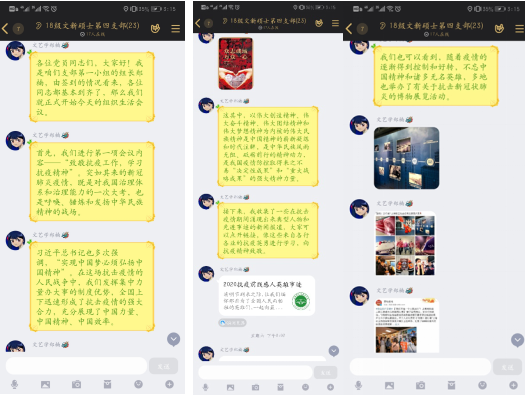 2018级文新硕士第六党支部组织召开了围绕疫情防控开展爱国主义教育的线上讨论会,2018级文新硕士第六党支部全体党员在微信群中踊跃发言、积极讨论。线上讨论会中每位成员都参与了发言,他们表达了对在抗疫一线的医护人员的致敬和对党和国家的深深热爱,并表示,应该发挥党员带头先锋模范作用,牢记使命,不忘初心,践行自己的诺言。
