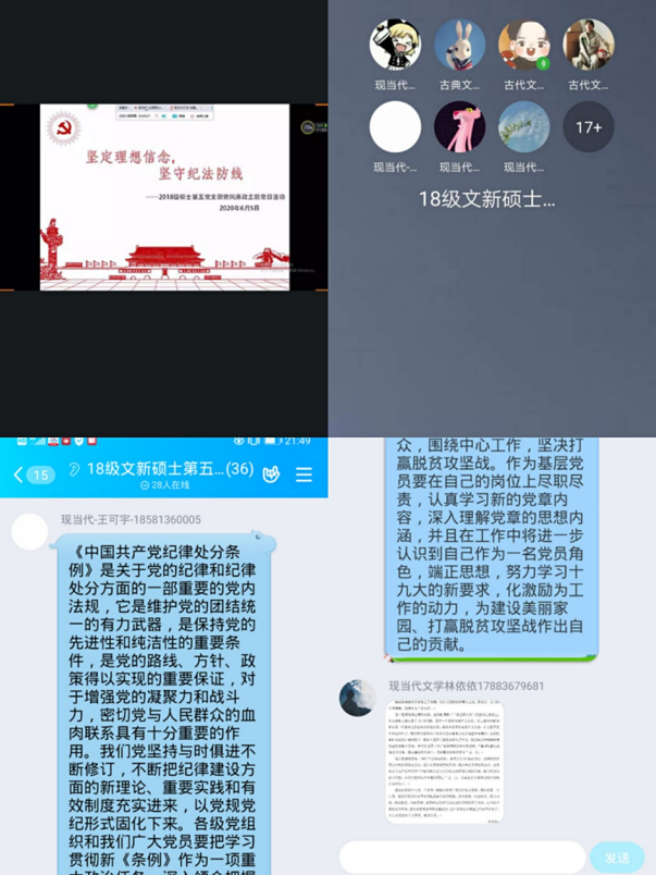2018级硕士第一党支部支部书记刘伊辛向党员们介绍了本次党会的两项内容:一是“共抗疫情、爱国力行”主题座谈会;二是党内法规专题学习会。刘伊辛书记组织党员们观看了抗疫视频《决胜:为人民而战》,学习抗疫先进事迹和典型人物,随后各位党员在线上发表自己的心得体会。二是党内法规专题学习会,学习会采用自学与集中学习两种形式。会前,各同志自学了《中国共产党章程》、《中国共产党纪律处分条例》。会上,支部书记刘伊辛带领大家全面学习了解《中国共产党纪律处分条例》的修订背景、新旧内容对照和修订意义,逐条解读新《条例》。与会党员对《条例》修订后的内容进行了深入学习。在此基础上,支部党员们交流了自己的学习体会。