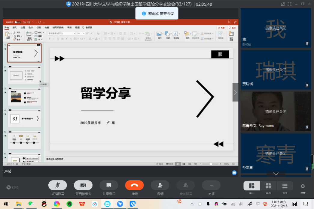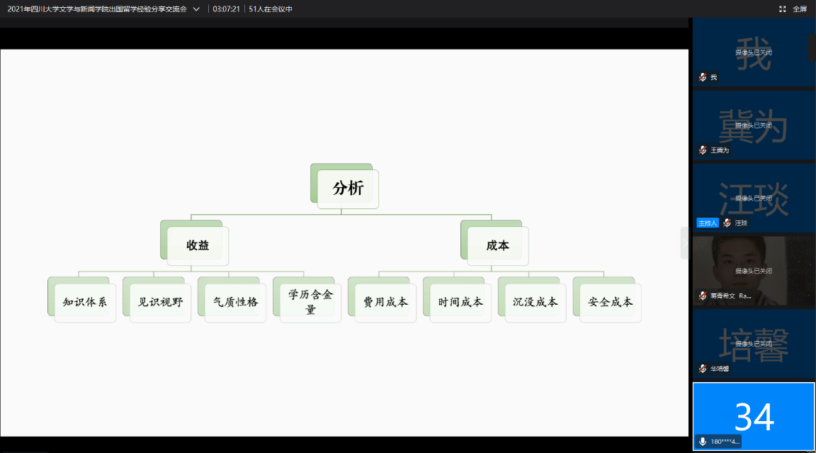 2020届毕业生周酝澄、2021届毕业生韩墨言、2019届毕业生卢璐、2021届毕业生华培馨、2017届毕业生李俊杰、2018届毕业生蒋青希文等六位留学经验丰富的优秀校友。本次经验分享交流会由汪琰同学主持。