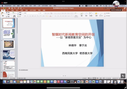 西南民族大学新闻传播学院林晓华教授报告的题目为《智媒时代新闻教育空间的开创—— 以“新密苏里方法”为中心》。他围绕着新传播格局之下学界对于新闻教育是以培养人文素养为主还是以工具理性为主的争论展开分享,介绍了自己通过进入美国高校课堂以及一流媒体的田野调查而总结出新闻教育方法:“新密苏里方法”。他总结到:新闻教育应当根据媒介需要进行课程改革,这是一种学科制度的创新。密苏里新闻学院对新闻教育的学科方向划分、人才培养模式、学科管理制度都有着系统性的创新,其融合创新的模式值得借鉴与参考。
