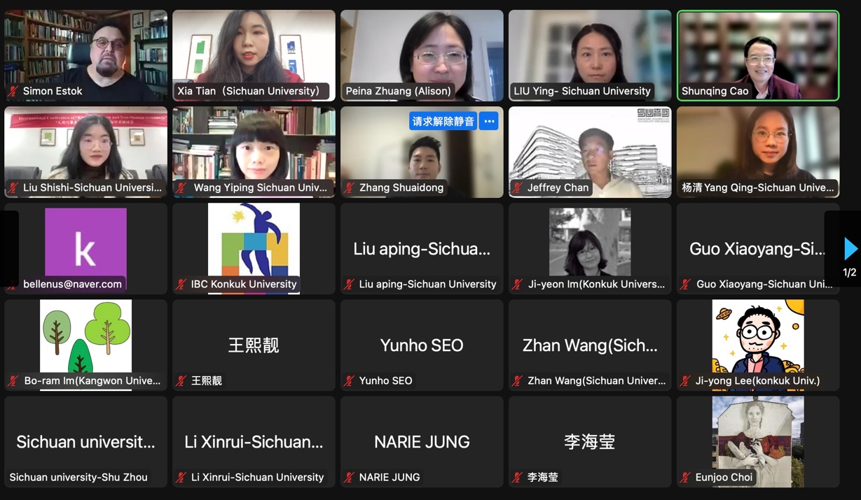 学术院长、欧洲科学与艺术院院士曹顺庆教授,刘颖教授,王一平教授,庄佩娜副研究员,杨清老师,张帅东老师,博士研究生刘诗诗,硕士研究生吴白羽,与来自韩国建国大学、美国纽约州立大学奥尔巴尼分校、韩国成均馆大学、韩国庆熙大学、新加坡大学、澳大利亚西悉尼大学、印度新德里国立伊斯兰大学等多所世界高校的专家学者,围绕人类与非人类的共生关系、现代技术与伦理思考等议题作了线上报告。在各方协同合作下,各国学者切磋交流、互学互鉴。