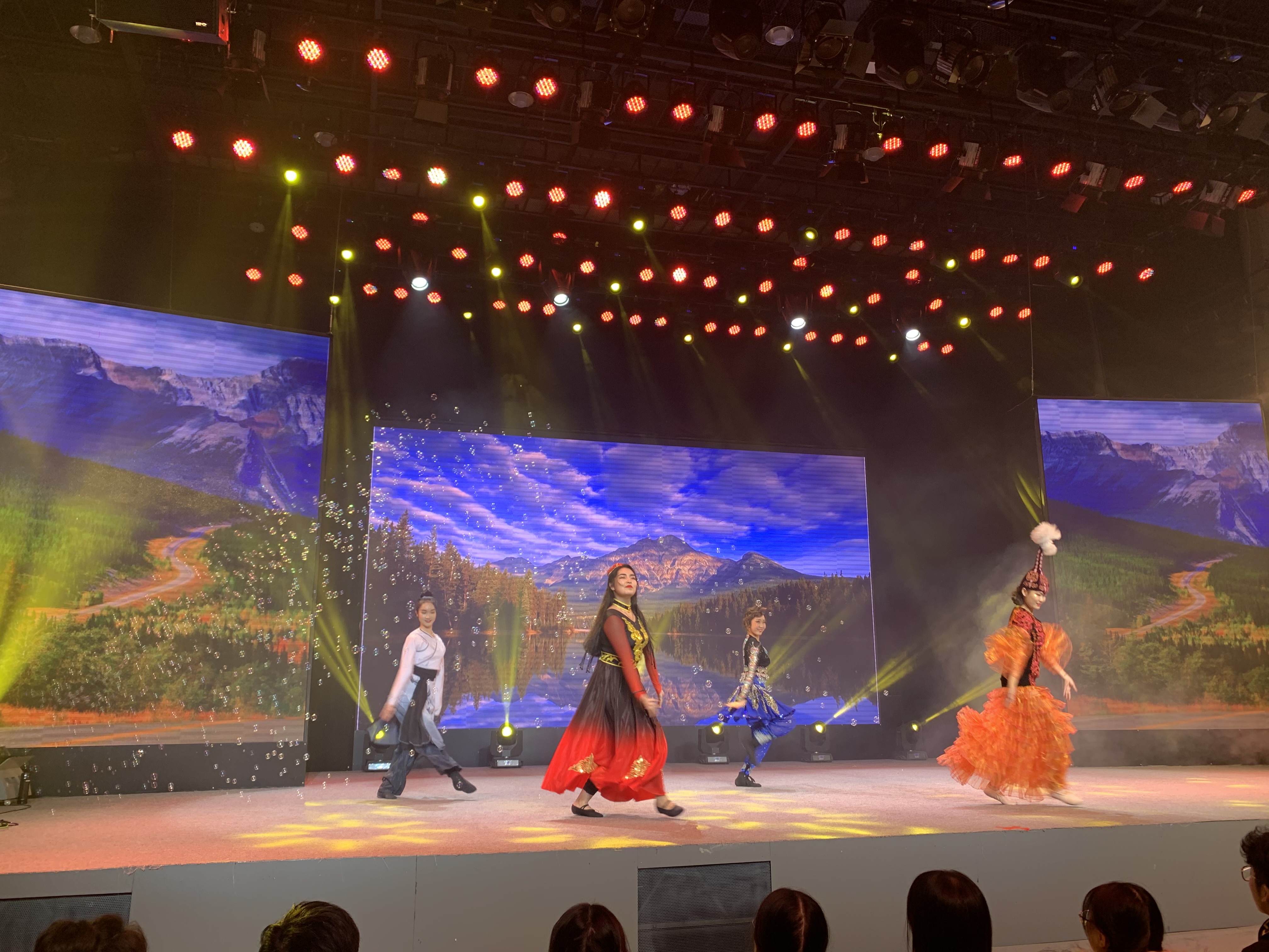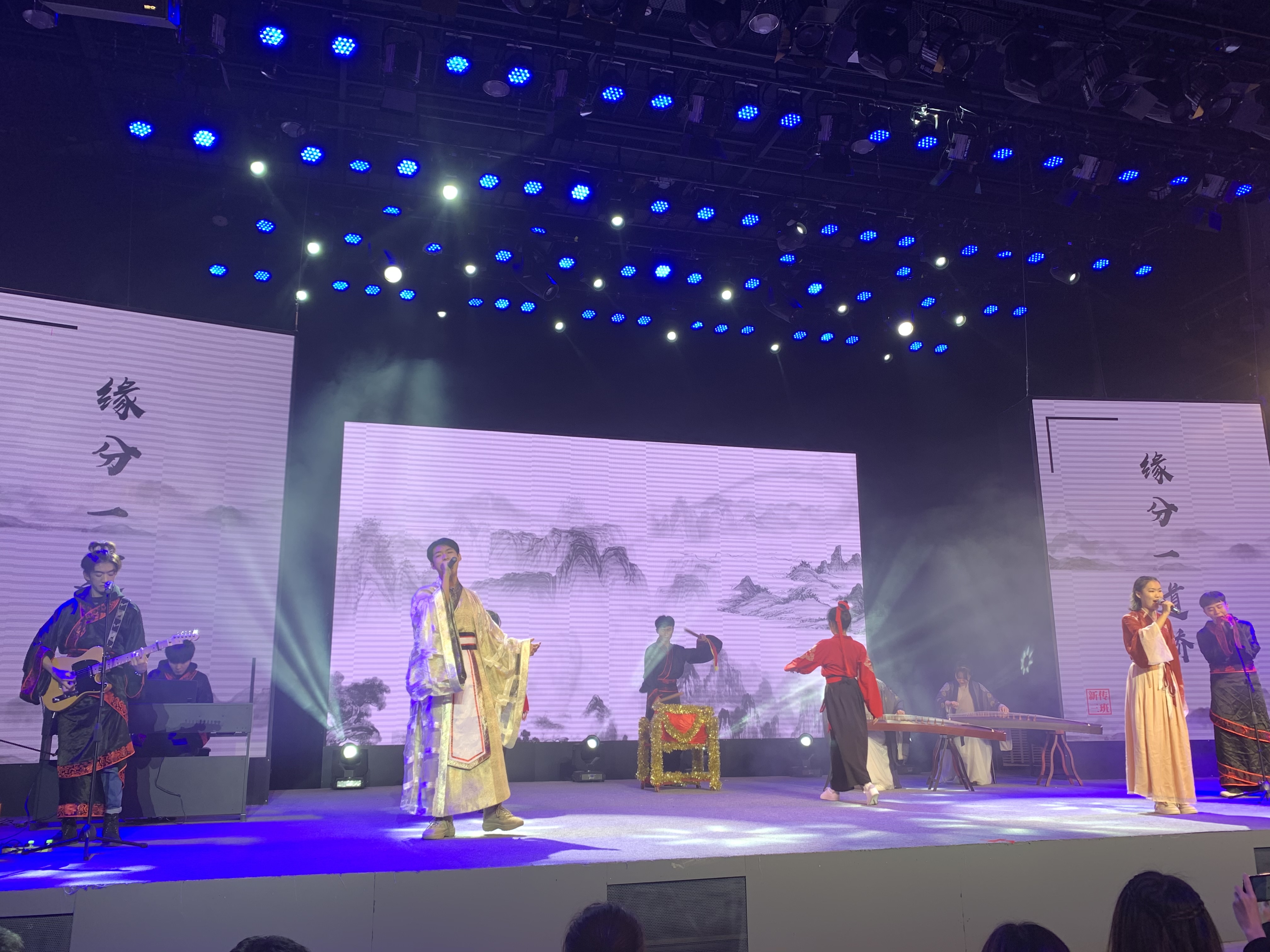 主要有舞台灯光系统、舞台音响系统、LED全彩大屏系统、摄像摇臂系统、一体化录播控制切换系统、舞台机械系统、舞台幕布系统等软硬件设备。面积共400平米,观众席座位260多个。