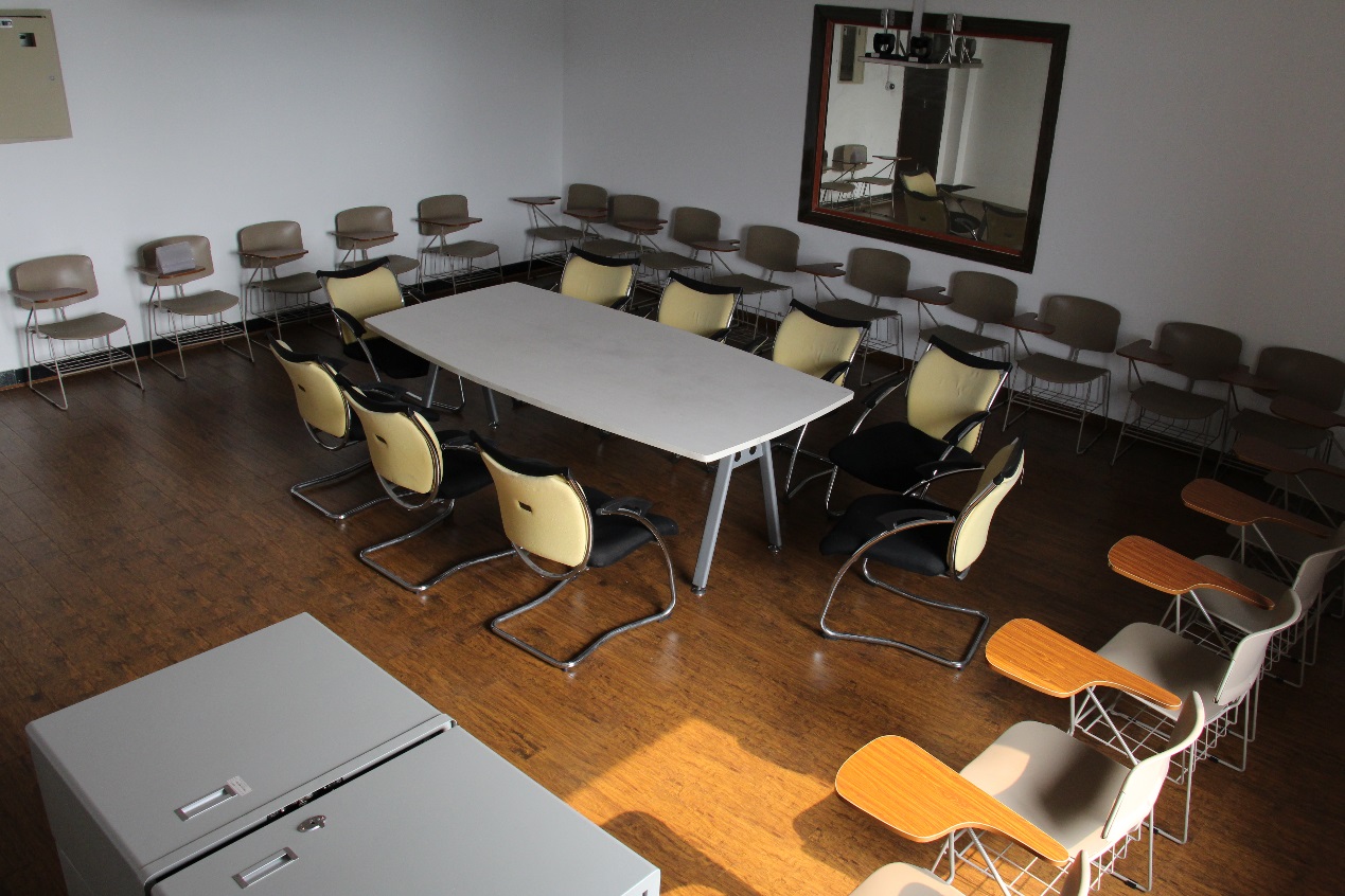面积45平方米。主要设备设施有会议桌1张,带小桌板的凳子20个,椅子9个,讲台及台式电脑1个,投影机1个,电子白板1个,空调1个,录播及音响设备,单向玻璃一块。